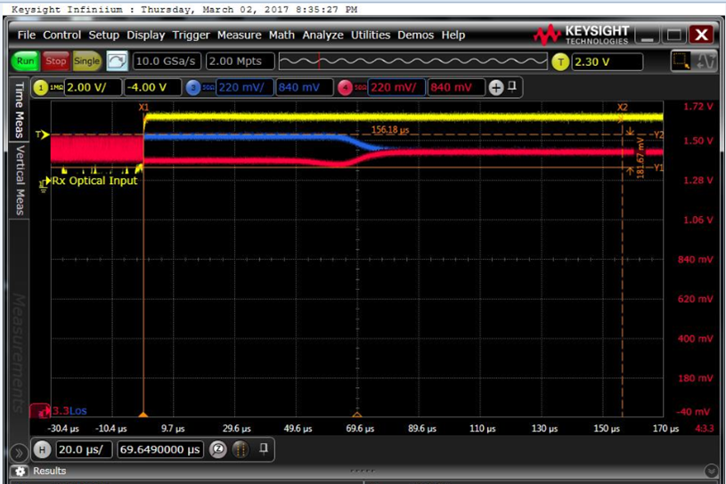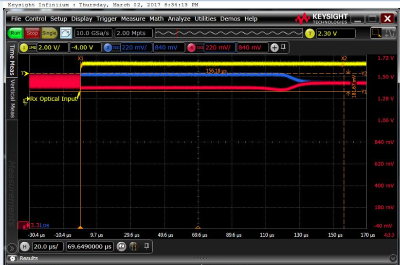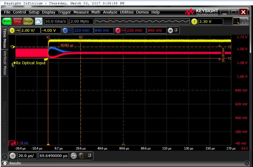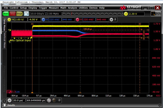 4.RX输入光为-15.0dBm时,关断输入光后TIA的输出波形如下: