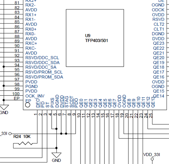 因此如果你采用了上面电路,DFO为低,输出ODCK为持续的,如果目前测试的时有时无,那么看下SCDT引脚输出状态,看下整个link是否为inactive的,输入TMDS信号是否为有效信号?