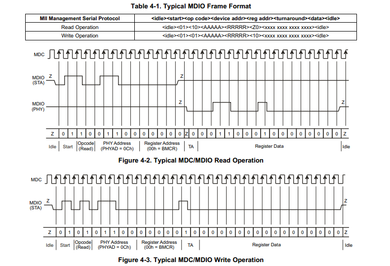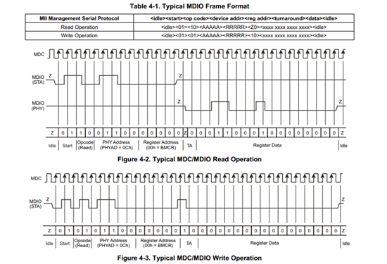 Table4-1给出了MIDO的时序图,可以看出读操作的start+OPcode为0110,写操作的start+OPcode为0101.然后是PHYAD[4:0]配置的5bit PHYaddress,再加上寄存器的地址,您这里为什么说寄存器的地址都是0101?