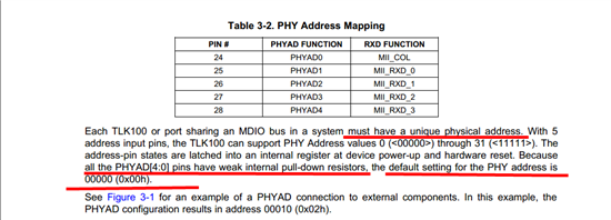 您好,多谢解答,是这样,我是用读命令去读取phy芯片中的不同的配置寄存器,读到的16位的值是0101,发现这个是自己程序的问题,但同时也注意到另外一个问题,这个TLK100PHY芯片,在上电时PHYAD[4:0]配置的5bit PHYaddress手册里说默认是00000,但实际是00001,