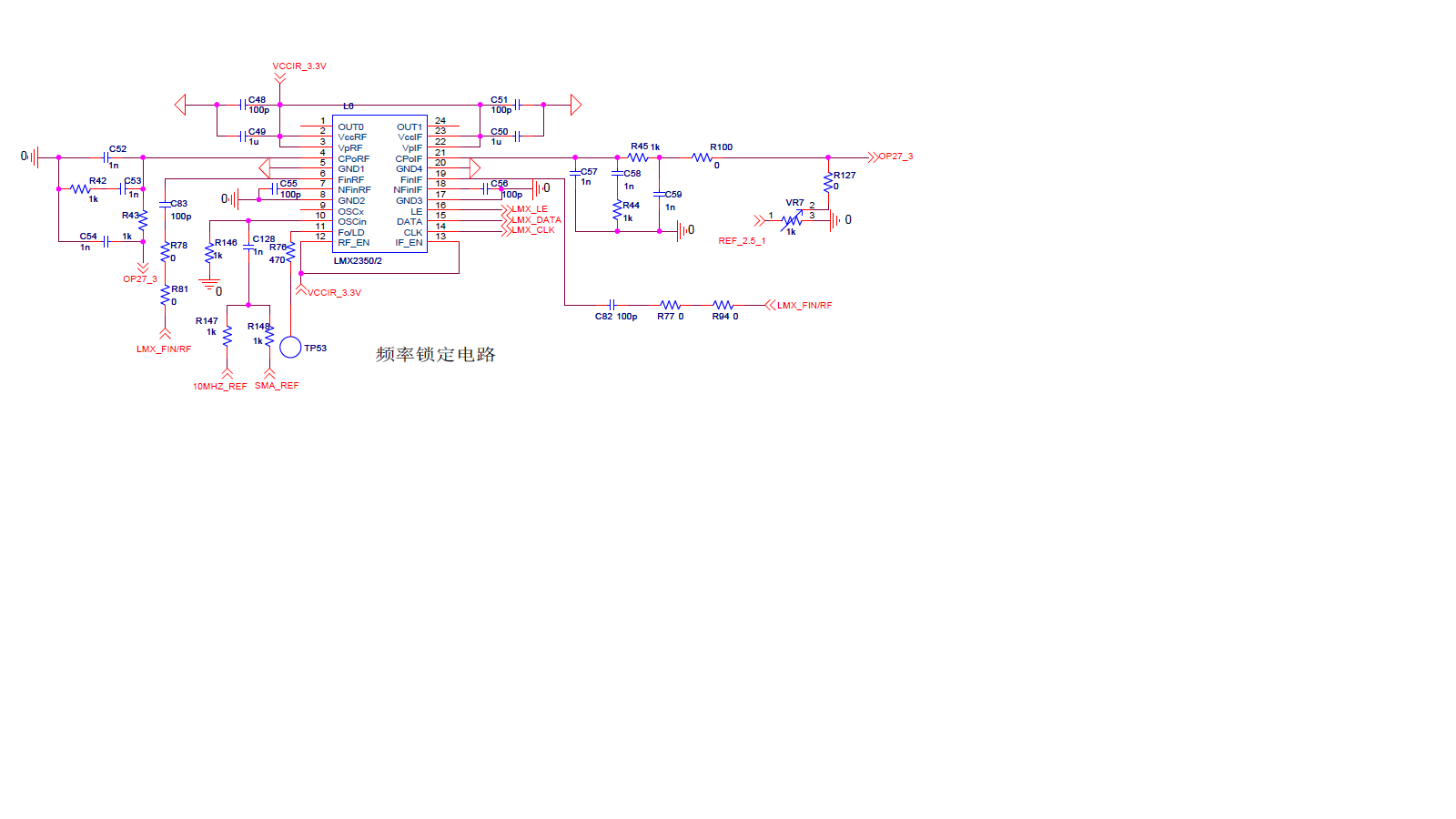 按下图电路和时序进行电路设计,只考虑中频段pll,断开R100,在R94出用信号源输入正弦波或者是矩形波信号,频率实时可调,若假设芯片的时序没问题,中频设计的输出频率为15MHz,芯片正常工作情况下,其R100的输出随着频率的增大应该如何变化,会是一个实时变化的直流信号吗??