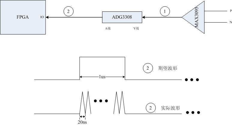 你好,使用ADG3308做电平转换,将RS422接收器驱动的5V转换成3.3V输入到FPGA 。2端的实际波形为一个50MHz的信号,正常波形应该如期望波形。将ADG3308与FPGA断开,则2处的波形正常如期望波形。将MAX3095与ADG3308断开,MAX3095输出的信号如期望波形 。请问是ADG3308的驱动不够,还是其他的什么问题。