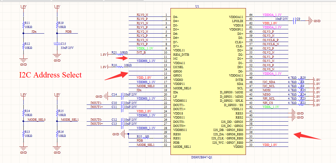 DS90UB947-Q1的IO口兼容1.8V和3.3V,所以先看下单片机是几V的,如果电平不符,需要做电平转换。