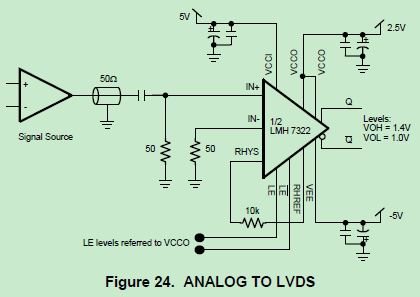 最近在使用LMH7322接收光纤接收器信号,配置为手册上推荐的从模拟信号到LVDS转换,如图所示,但是图1中未标出LE和LE not的接法。