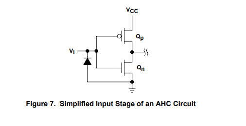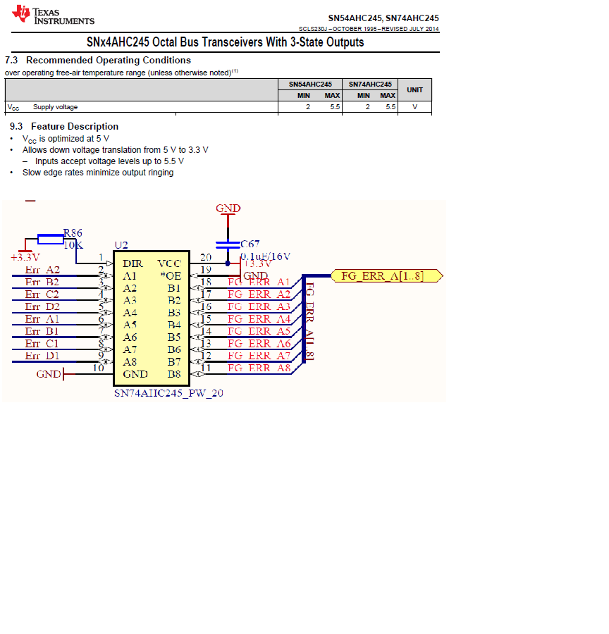 我们在在电路中使用SN74AHC245来实现外部电路5V逻辑电平到控制器3.3V的电平转换,轻载输出。按照datasheet的指示,包括文档Advanced High-Speed CMOS (AHC) Logic Family 2002 中都表述了这种低压供电,不高于5.5V输入的适应能力: