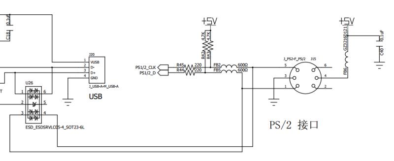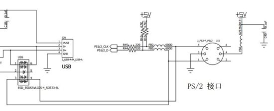 最近产品在做静电测试,发现空气放电 -8.5kv在PS2接口处容易死机。电路图和PCB截图如下。
