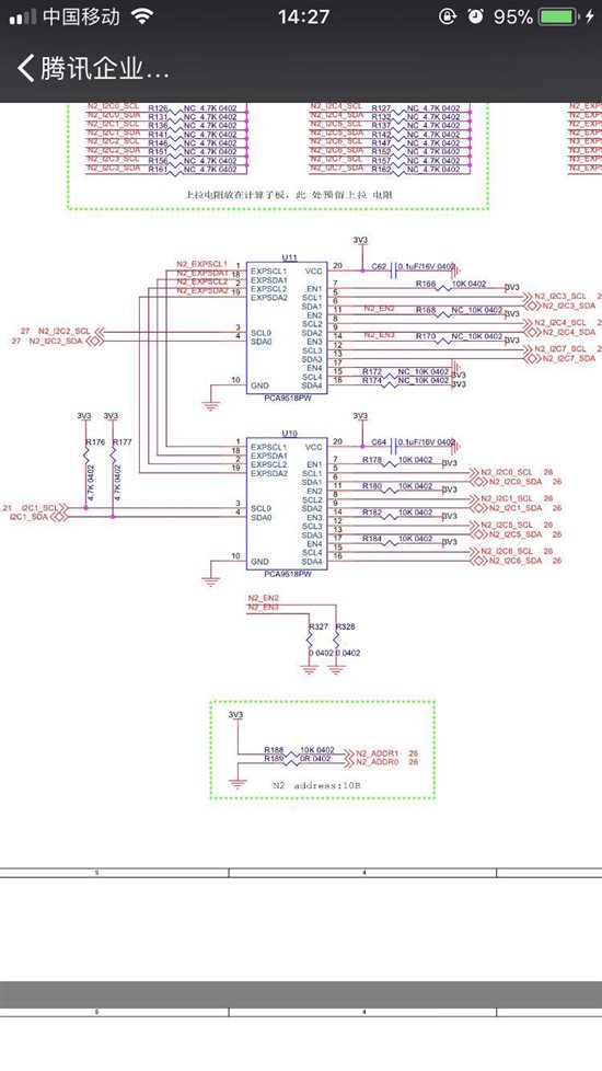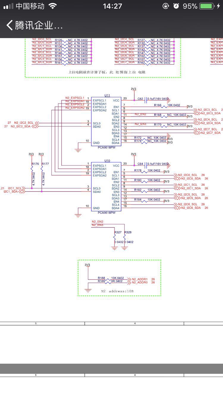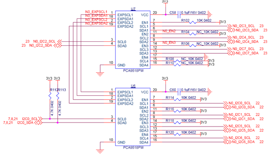 我的项目中目前用了八个PCA9518PW芯片,其中两个的连接情况如下图所示,请教一下,图中N0_EXPSCL1与N0_EXPSDA1(或者N0_EXPSCL2与N0_EXPSDA2)的走线长度有要求吗,还是说走线长度只要满足I2C的规范控制走线上的电容在400pf以内就可以,感谢