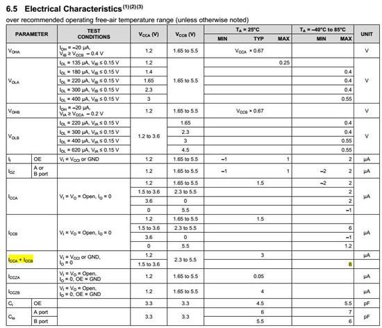 大家好,我想用TXS0108E,VCCa=1.8V, VCCb=3.3V, 看手册上DC特性那块,不是很懂,是不是就看那个Icca+Iccb,看这个的话好像最大也就8uA,不知道是不是这样看的?现在想知道1.8V,3.3V功耗大概多大