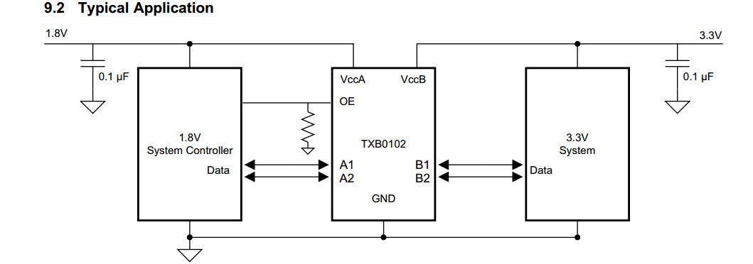 • 标准的接法是上电瞬间,OE为低,输出disable,为高阻抗状态,当电压完全起来之后,OE拉高,TXB0102使能,正常工作。