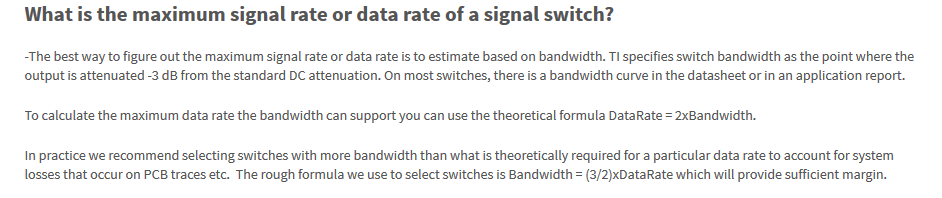在 中推荐的信号开关的带宽是1.5倍的数据速率。您的LVDS的速率是多少呢,TS5MP645的最小带宽是1.5GHZ。