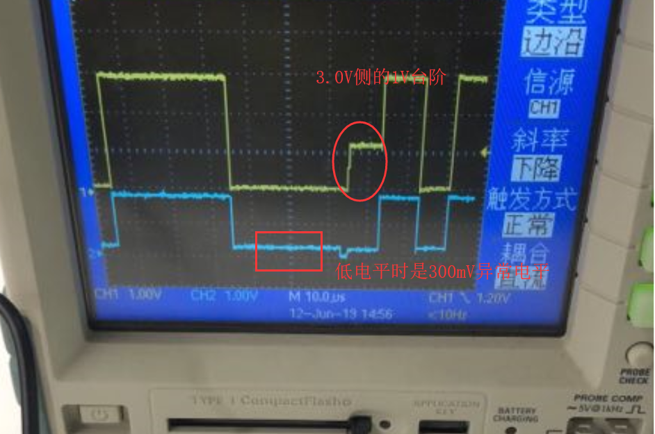 2、该故障导致了3.0V一侧的电压异常,有个台阶1.0V,如图二所示。从而导致系统误判是高电平,形成逻辑错误。