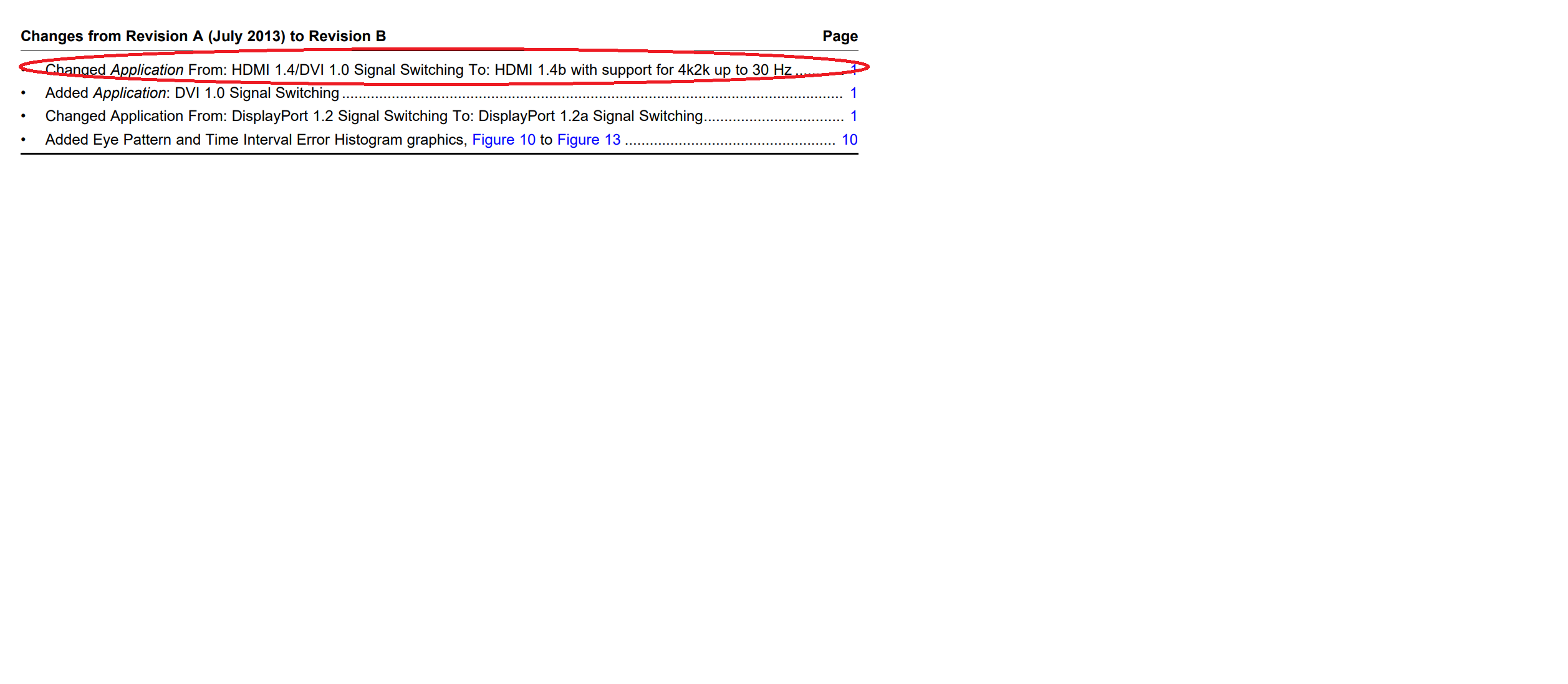 • 您好, datasheet中这个revision history 指的是从版本A到版本B的更改, 我们现在用的最新版本为版本F了,所以数据手册上写的是支持4K60HZ。