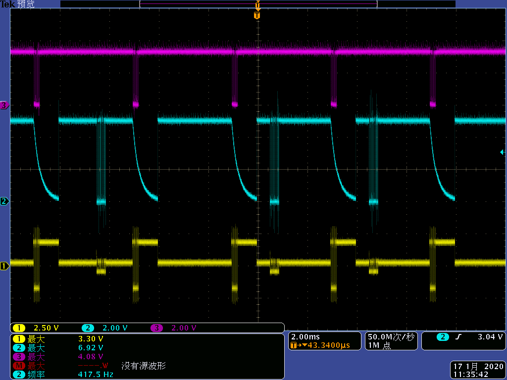 1、电路1 中,RS485芯片SN65LBC176的1引脚RO信号在没有数据时会出现1ms低电平(类似RC放电曲线),如下面测试波形;经过与门电平转换后,在DSP侧引脚的SCIA_RX信号测量,则没有出现1ms低电平。
