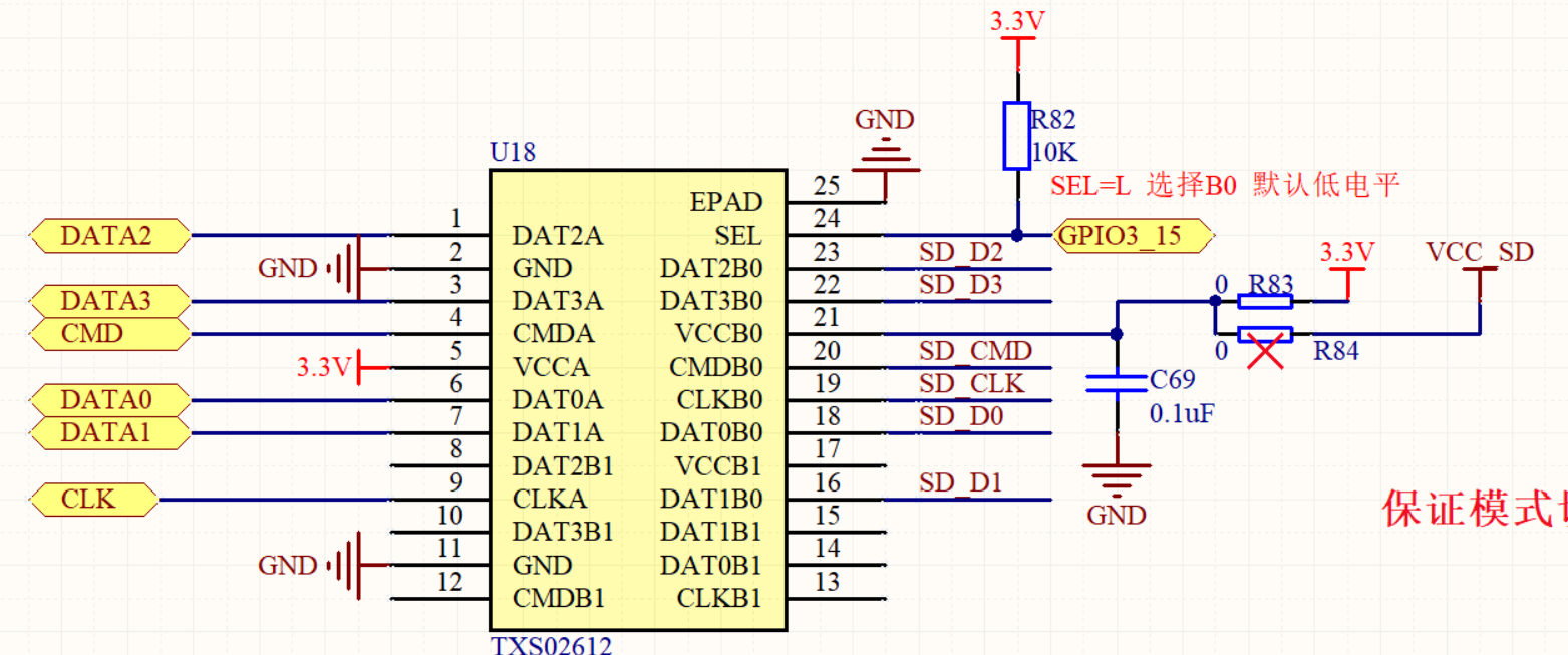 目前需要做一个SD接口的电平转换,测试中遇到问题:电路图如下所示,测试时R83连接,SEL端设置为低电平,CLK输入27M时钟,但芯片19脚无任何输出,请问是何原因?
