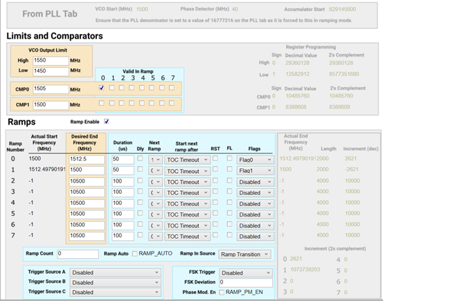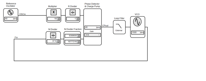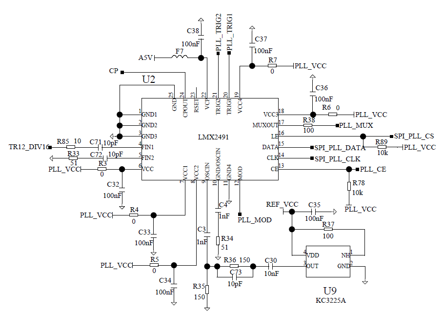 我使用LMX2491生成1.5G-1.5125G连续三角波调频信号。通过TICS软件生成R141~R0的寄存器后,将寄存器配置拷贝单片机程序里,使用单片机配置LMX2491(从R141降序到R0逐个配置,用示波器测试SPI信号与预期相符),但是LMX2491未锁定(外接VCO频率未变),并且LMX2491的电流未变(3mA)。下面是硬件电路图和TICS的配置,请帮忙看看可能是什么原因。十分感谢!