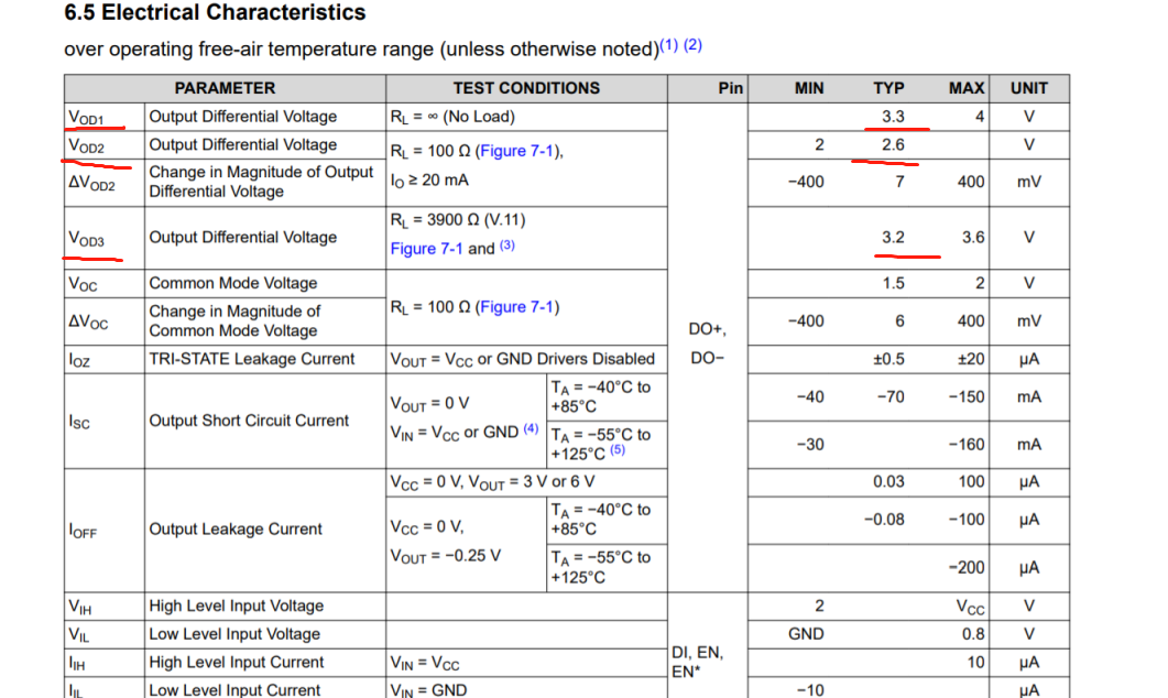 请问DS26LV31T 这个422芯片的4路差分输出的信号电平都可以达到3.3V吗?怎么手册表格上写第二路VOD2差分输出的电平只有2.6V。见下图