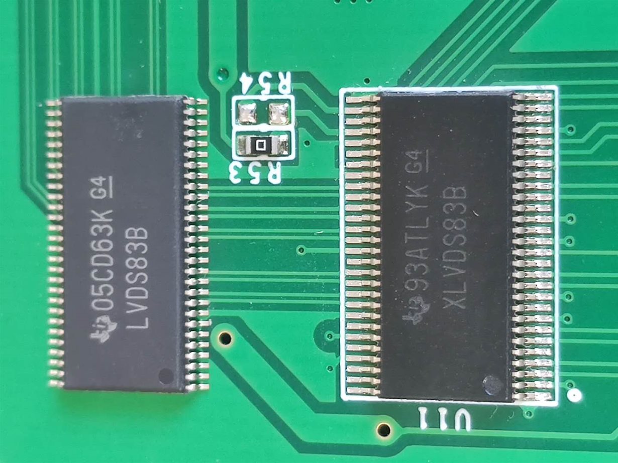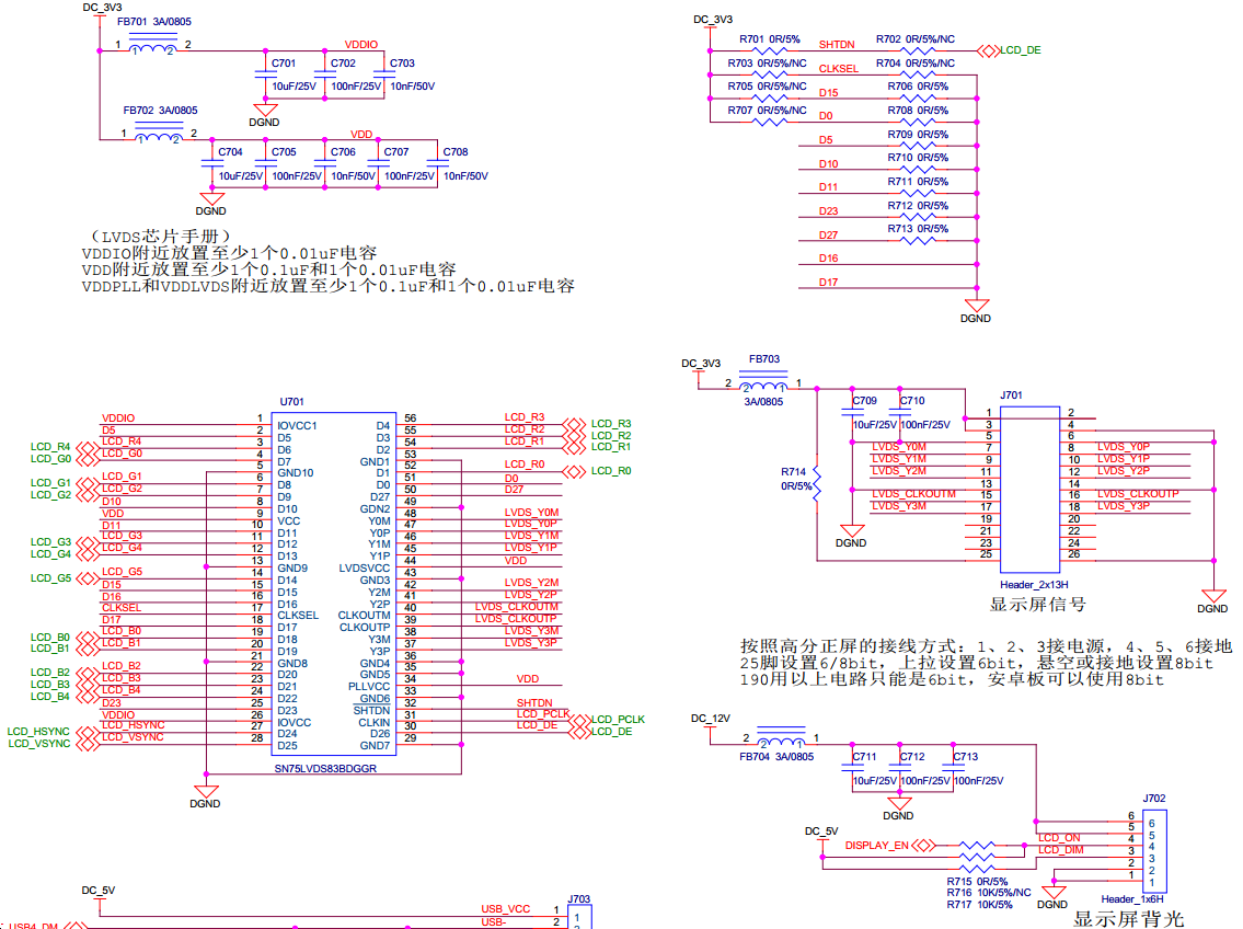 此核心板和RGB转LVDS方案已在其他产品上验证过,均能正常显示。新产品的原理图已对照和之前的原理一样,但LVDS屏幕花屏,只显示一条一条的横线或块,测量RGB端时钟信号正常,LVDS端时钟和信号波形都很乱(和正常的底板对比测试,正常显示的底板lvds端波形也比较规整)。