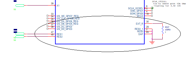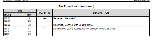 您好,这几个引脚都是reserved 引脚和Not connected引脚,您指的是不是EVM中的RES0 和RES1的名称反了? 以datasheet为准,这几个引脚的 EVM中的电路连接是没问题的。 NC可直接悬空,RES可下拉到地。