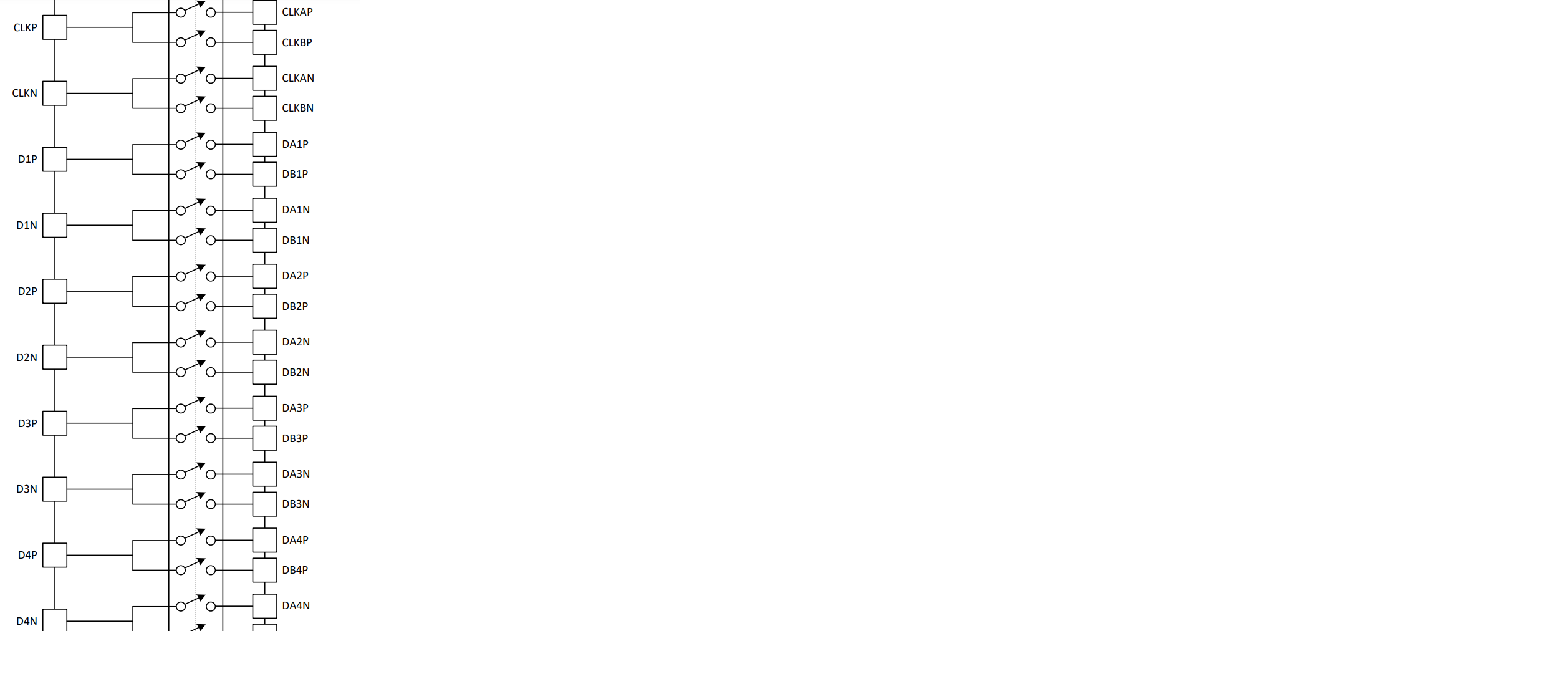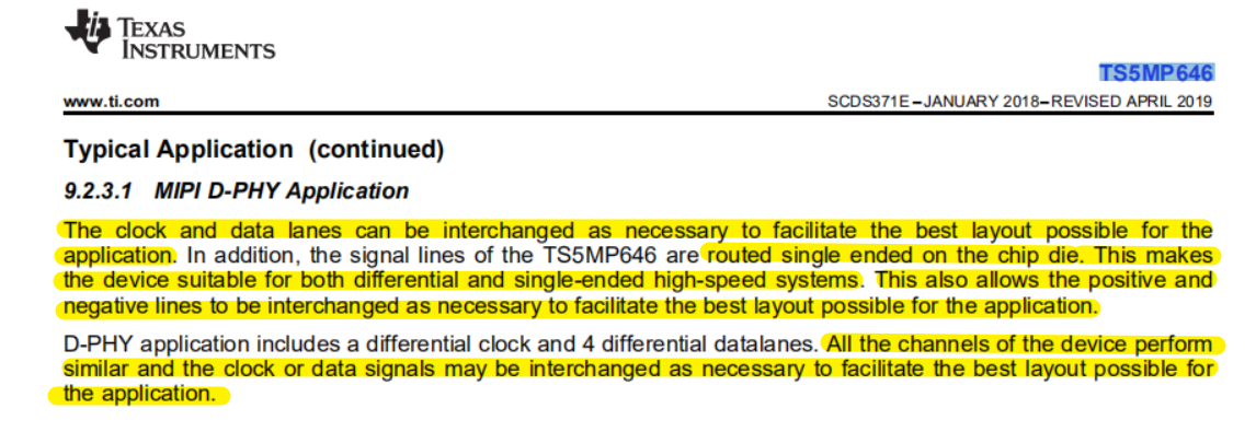 我看数据手册说明,通道间可以更换使用,比如D1和D2,或D1和CLK通道间互换等。另外差分对间的正负极也可以更换。并且信号在片内走线是单端的。
