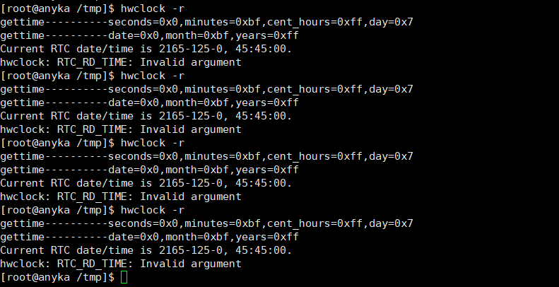 下面是在Linux系统下去读RTC芯片时间的结果,可以看到每次读到的值都是一样的。然后测量了外部晶振信号,发现根本没有起振: