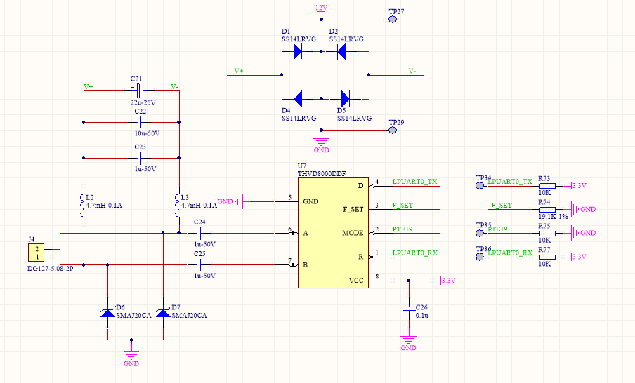 关于THVD8000收发器,我选用的波特率是38400,带载频率为500KHz,F-SET管脚选用电阻19.1K。从机的电感按照32节点计算选用的电感值为4.7mH的电感,但是实验时只用了7块从机进行通信,电容选用的是1uF的电容。具体外围电路可见附件图片。实验过程有加60Ω的终端电阻,然后出现了以下问题。能帮忙解决一下么