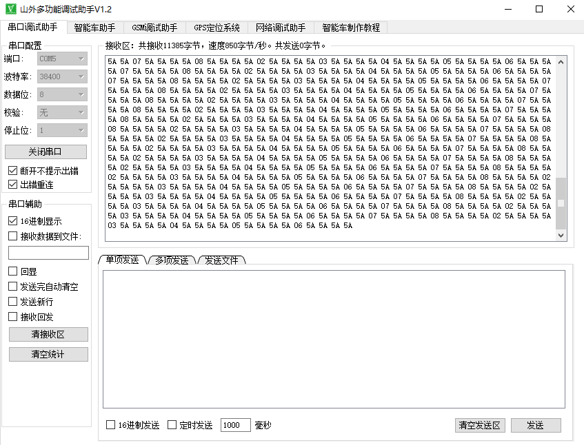 而在进行多从机通信时,按照您的建议加上了终端,由于没有60ohm的电阻,我用56ohm的电阻进行了替代。情况还是没有变化 。然后我的主机程序是这样的:主机先给第一个从机发相应数据,在得到从机回发的数据并且判断数据正确才会发送下一个从机的数据,就这样一直循环与7个从机通信。如果从机回发的数据错误,主机会再此发送相同的数据,如果是主机没接收到从机的数据,主机就会一直处于接收状态,从而停止发送。所以可以判断通信中断是因为在通信过程中某个从机没有回发数据。下面是串口助手得到的数据:一般情况下通信状态就像第一张图,具体在哪个从机通信停止是随机的。第二张图通信状态比较好的情况,能通信10s左右,但是最终还是会中断。