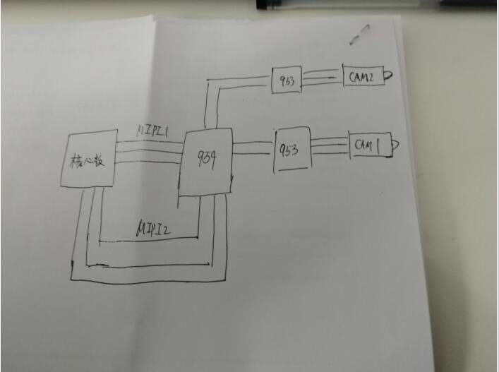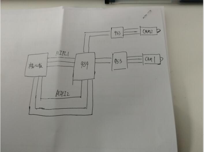我想通过一个954外扩两个953芯片达到一个核心板可以接两个摄像头的目的,我想问一下,通过这种方式可以让两个摄像头同时拍照上传吗,功能图如下所示: