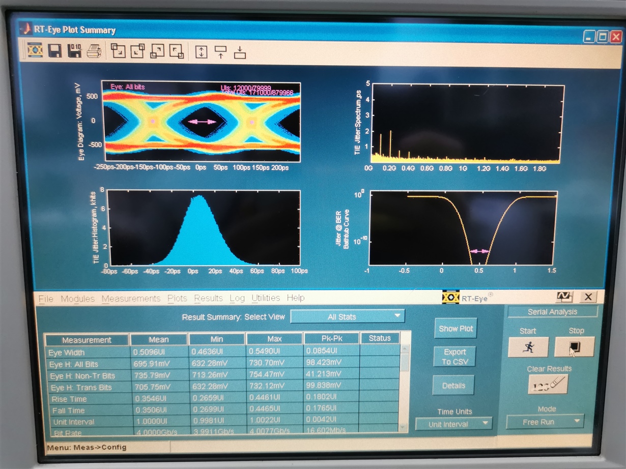 如图,我们使用CMLOUT+-测出来的眼图信号,感觉抖动很大而导致眼宽偏小。实际应用中,会存在视频卡顿或者中断的现象。