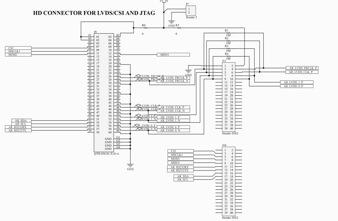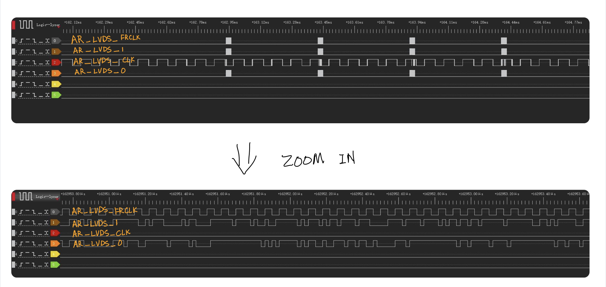 这是我参考了评估板的原理图后设计的PCB原理图。将LVDS_CLK, LVDS_FRCLK, LVDS_1, LVDS_2的差分信号引出后,使用逻辑分析仪进行分析得到的波形如下。