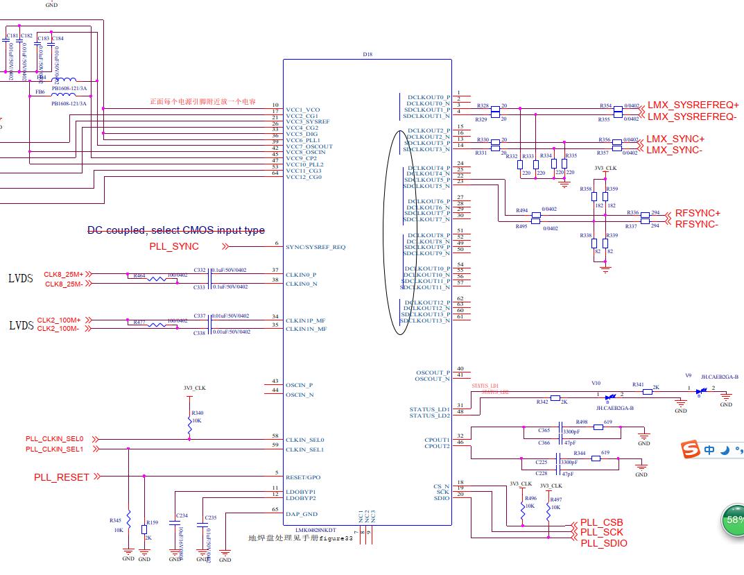 我用了LMK04828芯片,仅用到了时钟同步功能,未使用PLL,因此芯片43/44引脚的参考时钟悬空未接。