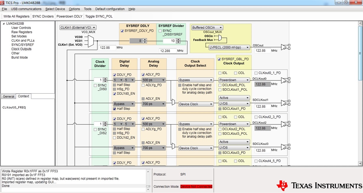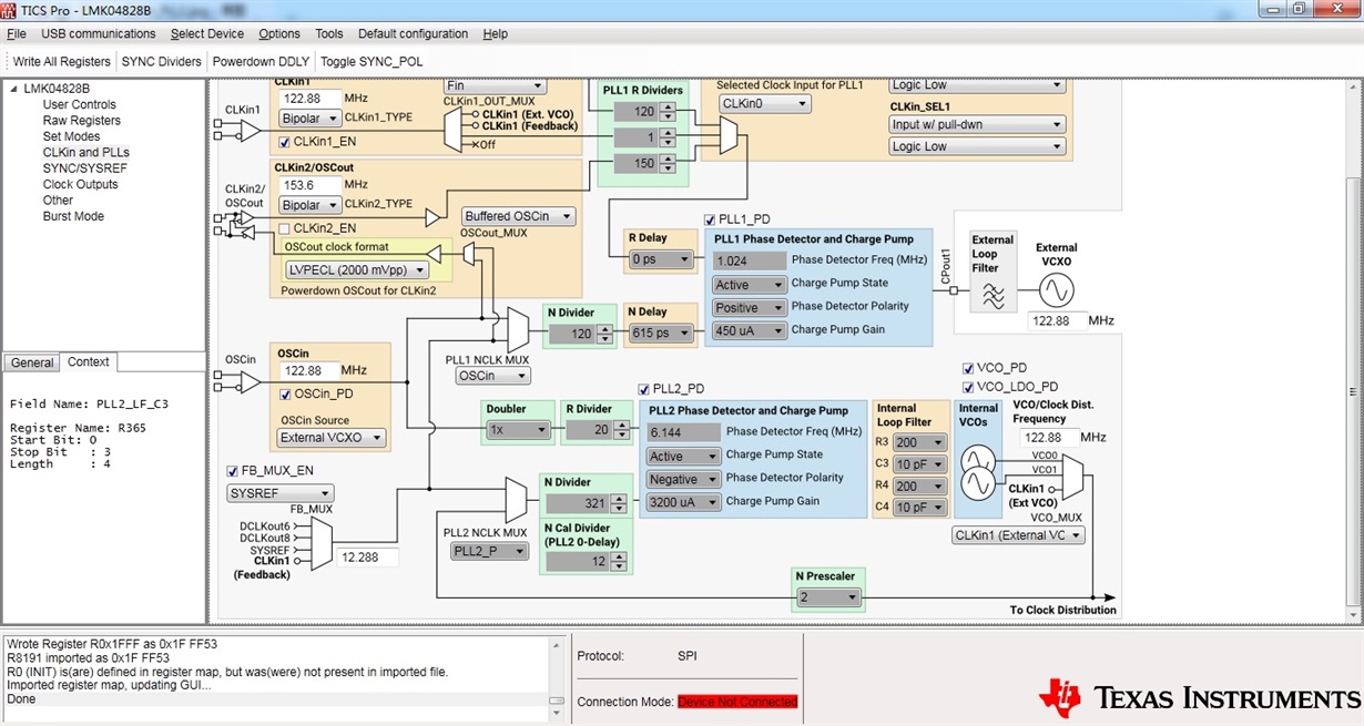 • 您好, 我是想看下TICSPro的CLKin and PLLs页面以及Clock output 页面的配置,一般情况下配置好了, 生成的寄存器没问题的。