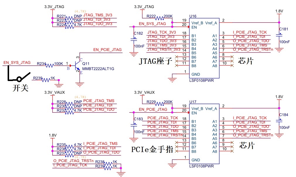 我想用两个LSF0108做JTAG切换,任意时刻只有一路(图中的JTAG座子或者PCIe金手指)到芯片的JTAG。其中一个LSF0108的EN接到了拨码开关,然后EN三极管反相后接到另一个LSF0108的EN,请帮忙看下原理图是否正确