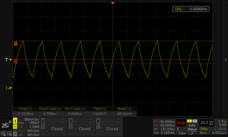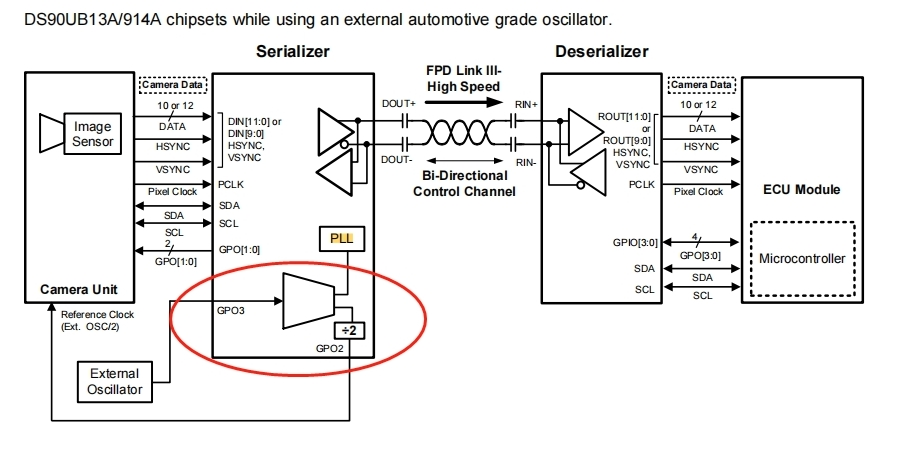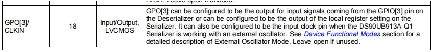 我们在使用DS90UB913 Serdes,将GPIO3作为CLKIN功能用(外部晶振输入,频率为37.125MHz),目前遇到问题如下,其中我们应用VDDIO=2.8V