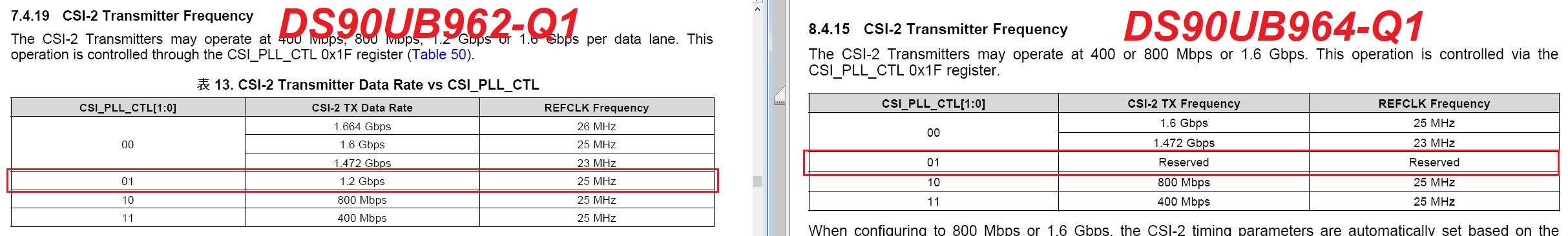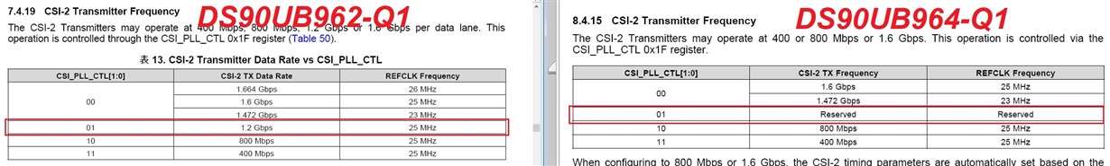 我司有个项目之前是用DS90UB962量产(只使用了2个Lane),现在由于缺货,改为DS90UB964。由于软件设置为1.2G的速度,如果改为964,我们设置为“01”,964那里的Reserved 的速度是多少?是和962一样吗?能使不改软件直接替换吗?谢谢