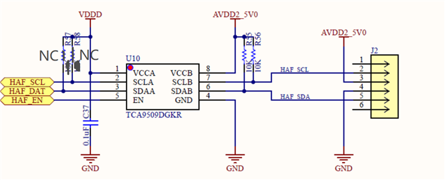 sideA供电侧3.3V,sideB侧供电5V,sideB侧的SDA和SCL各加4.7K的上拉电阻,EN端拉高,在sideA的添加测试信号,用示波器测量发现sideA有脉冲信号输出,sideB侧使用时高电平,是哪里的问题,谢谢。
