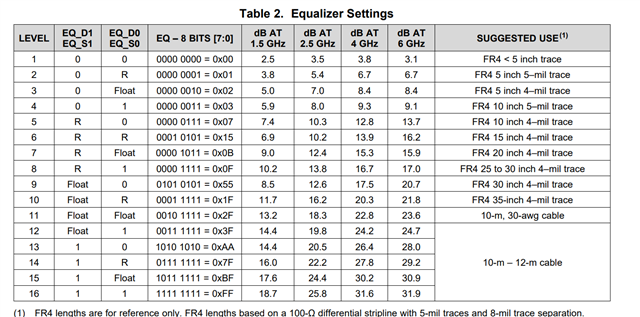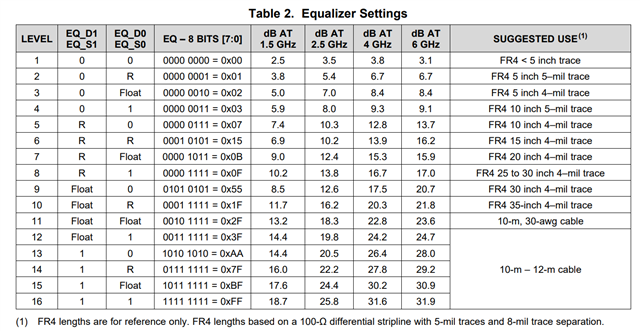 您好,参考Table 2的关于EQ level的配置,针对不同走线长度或cable长度,以及在不同频率下的level配置都给列了出来。