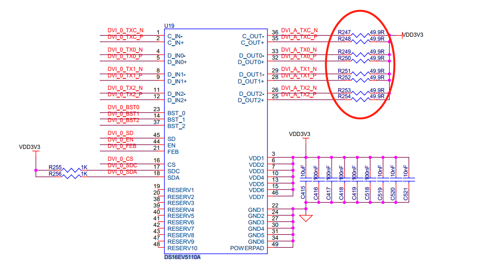 如图,dvi实处芯片,输出的8个信号线,数据手册上指导上拉电阻是50殴,