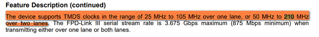 (1)看DS90UB949A数据手册,2-lane模式下TMDS时钟应该是50~210MHz,1-lane模式TMDS时钟最大是105MHz?这个值是否就是REG[0x5F]的值?