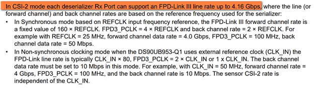 这个应该是不需要设置的,960输出每路CSI-2的最大带宽为1.664*4=6.656Gbps,960是四路独立的通道输入,然后通过分配虚拟通道然后整合到CSI-2输出,只要960的输出能力满足需求即可。这里有一篇关于深入理解FPD link速率的应用手册,讲的很详细 ,您参考下: