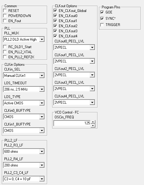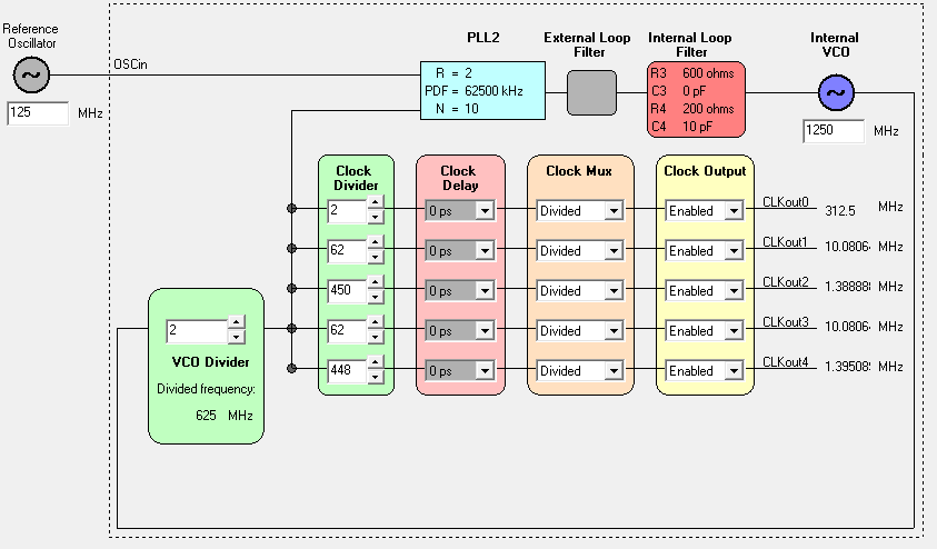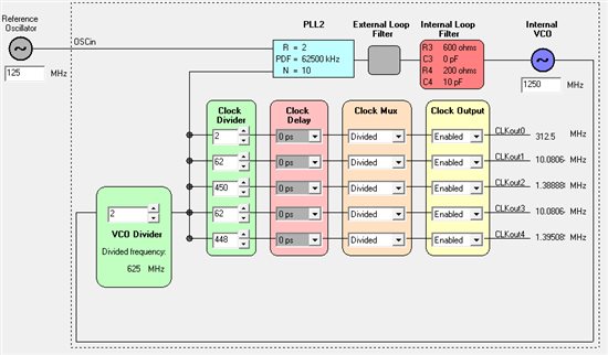 未使用PLL1,只使用了PLL2,OSCin频率为125MHz,差分幅度为800mV,复位时CLKout2=50M,编程以后,也只有CLKout2有输出,频率为20MHz,其他四路均无输出。配置信息如下图所示。最后一副为CPout2的滤波信息。