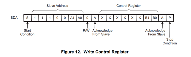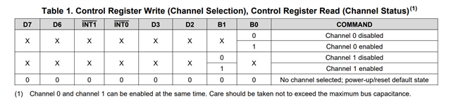 以上是以写为例,control register 中的B1B0是用来对通道进行选择的。参考Table1.也就是说,如果选取CH0,则B0=1,如果选择CH1, 则B1=1,x代表的是在对通道进行选择式,其他几位x既可以写1,也可以写0. 比如选取CH0, 那么control register这里可以式00000001, 也可以是11111111,都代表的是选择CH0.当通道选取完之后,stop命令之后,主机可以重新发一个起始条件restart信号,然后是CH0的地址,对其进行配置即可,当完成CH0之后,可以再发一个起始条件对CH1进行配置。