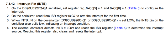 如果deserialzier端INTB被拉低的话,那么serializer端的INTB也会被拉低,外部控制器检测到INTB为低之后,读取ISR寄存器确定中断源。