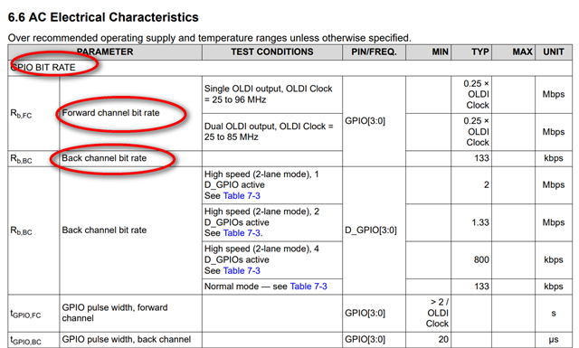 您好,可以使用GPIO通过serdes用于UART通信,通信速率取决于GPIO的速率,而GPIO的速率又取决于您是使用的Forward Channel正向通道传输,还是back channel传输。