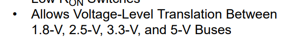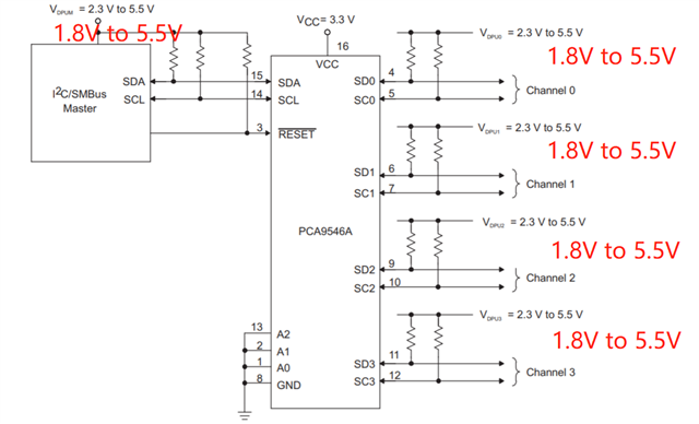 大家好,我在使用PCA9546A的时候,想用到1.8V到3.3V的BUS总线电压转换,是否可行,手册上介绍是可以,但典型应用中,只看到了3.3V到3.3V或5V的电压转换。
