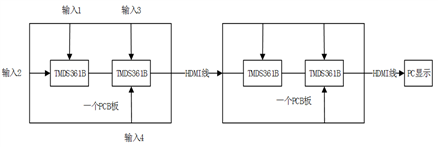 您好,我们公司使用四个TMDS361芯片级联出现图像抖动的情况。如图所示,我们的一个PCB板上设计了两个TMDS361B芯片,用两块PCB板进行连接。输入1和输入2接相机设备时PC显示的图像有躁点,输入3和输入4正常。TMDS361B芯片是否支持这种四个芯片级联方式?另外同样的接法,两个PCB板用7米的HDMI线不会出现上述问题,用1米的HDMI线就有躁点,这是否和芯片内部的自适应均衡器有关?期待您的答复,谢谢!