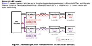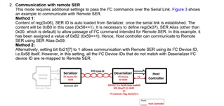 您好,没有DES Alias或SER Alias寄存器的,我想可以使用这个method 2:先enable I2C pass through和I2C pass through all。允许和remote DES ID 或者remote SER ID进行通信。 所以这种方法是不需要DES 或SER Alias的,只使用remote SER/DES ID.