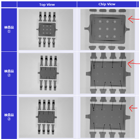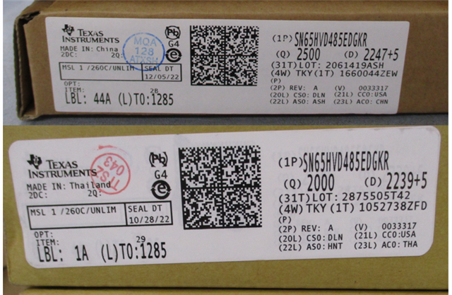 左图是两个产地SN65HVD485EDGKR的X-RAY 芯片内部构造对比,其中检查品1是对应右图made in China的,检查品2是对应右图made in Thailand