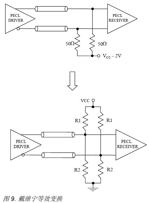 PECL互连的时候,在直流耦合的情况下,是需要端接50欧姆然后接到Vcc-2的电平上,然而端接结点上的电压应该是Vcc-1.3V。