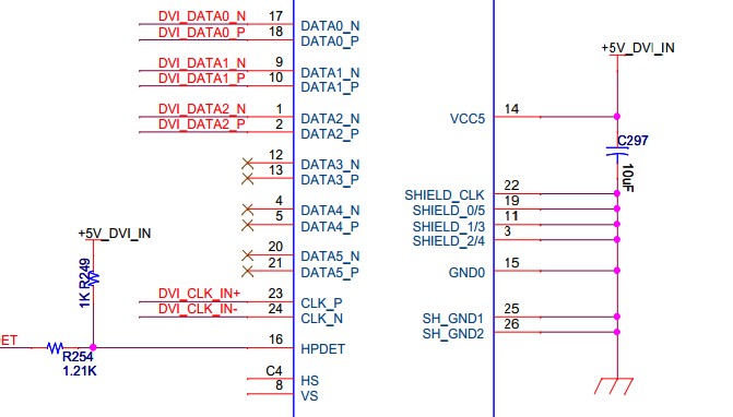 EEPROM由PCB3.3V电源供电。串联22欧电阻与DDC通道连接,上拉电阻2.2K。PCB板上HPD热拔插检测信号与dvi线缆的第14Pin+5电源连接,串一个1K电阻。这样,接上电源,然后接上DVI线缆,DVI的14Pin+5V电源提供给16pin的热拔插信号,测得HPD信号为2.7V,DDC应该产生读EDID数据的SCL信号。可是似乎SCL、SDA一直是高电平。请问电路哪里错了呢?DDC和I2C那样通过串联电阻直接连接可以吗?