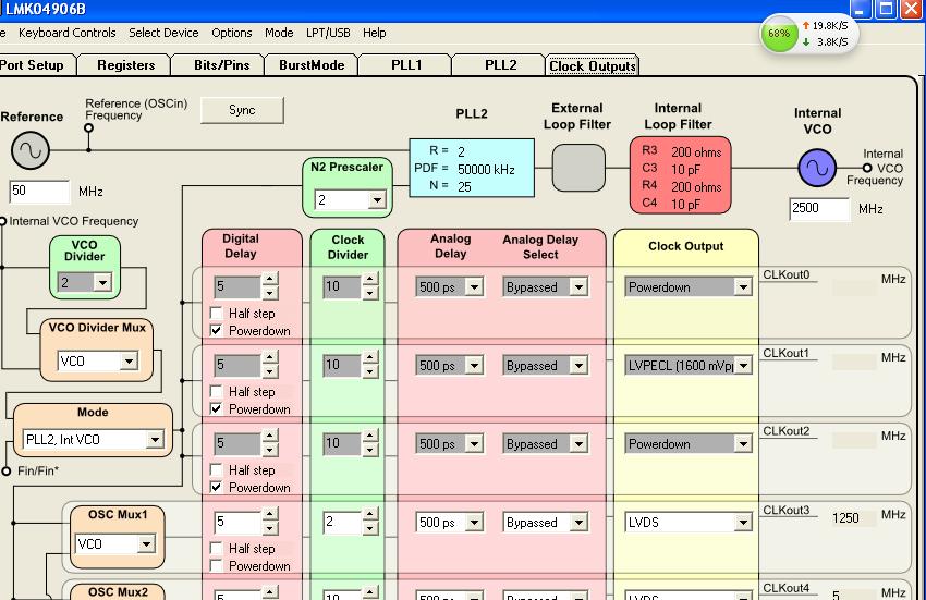 配置的PLL2 IN VCO模式,输入是50M晶振,由于只用到PLL2模式,所以CPOUT1并没有链接到外部50M VCXO上,请帮忙看看是哪个地方不对导致的PLL2无法锁定?非常感谢~~